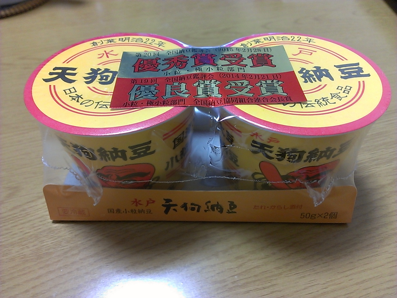 天狗が目印の天狗納豆です。2つ入って200円くらいします。