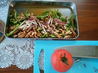 ミョウガ、ピーマン(レンジかけたもの)、トマトをきざみます。